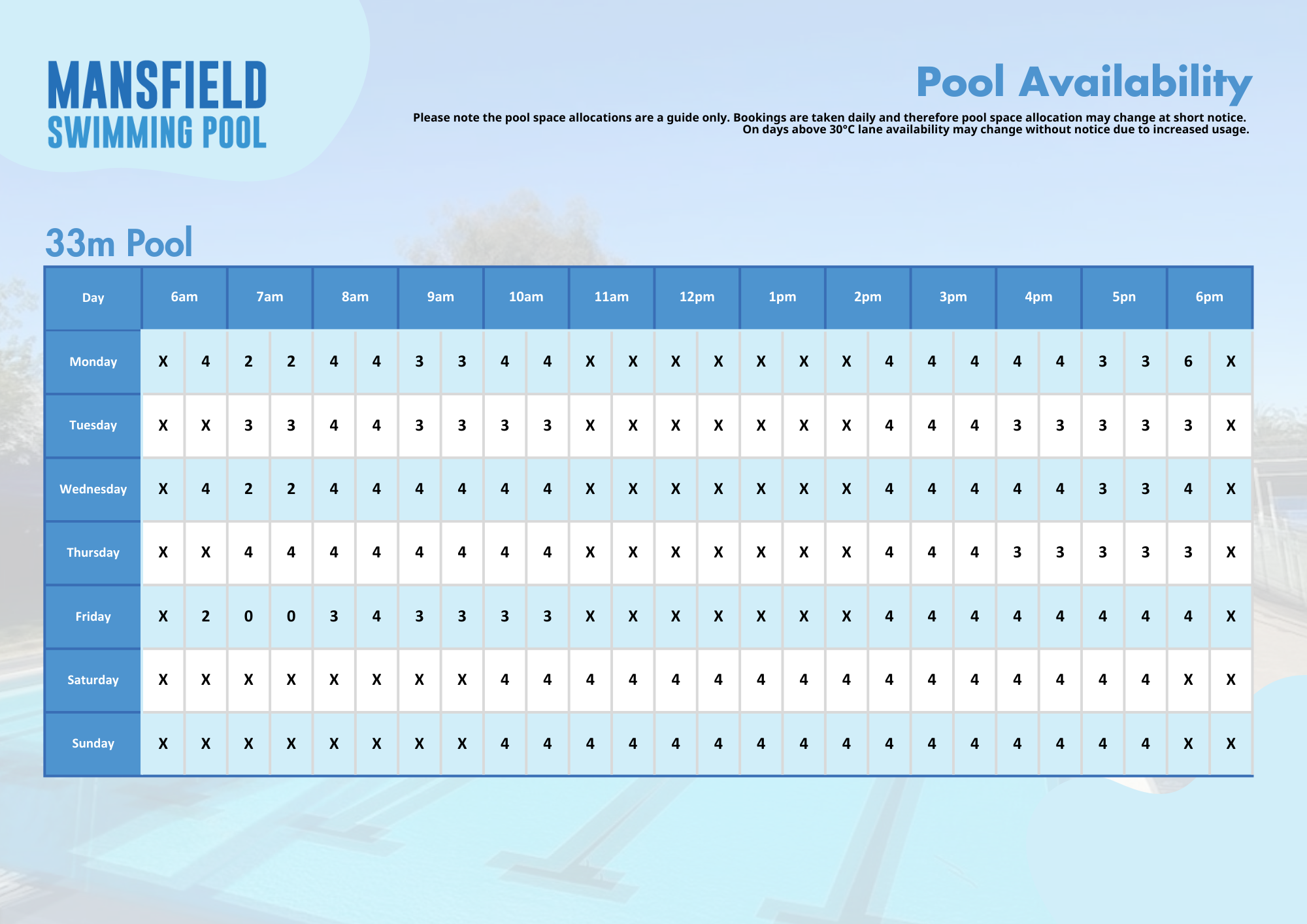 Please note: Friday mornings are currently heavily booked, and there are no lap lanes available between 6.30am and 8.00am.